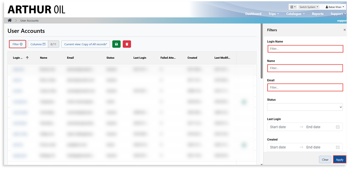 b. Search for the user account by entering the Login Name or First/Last Name or Email