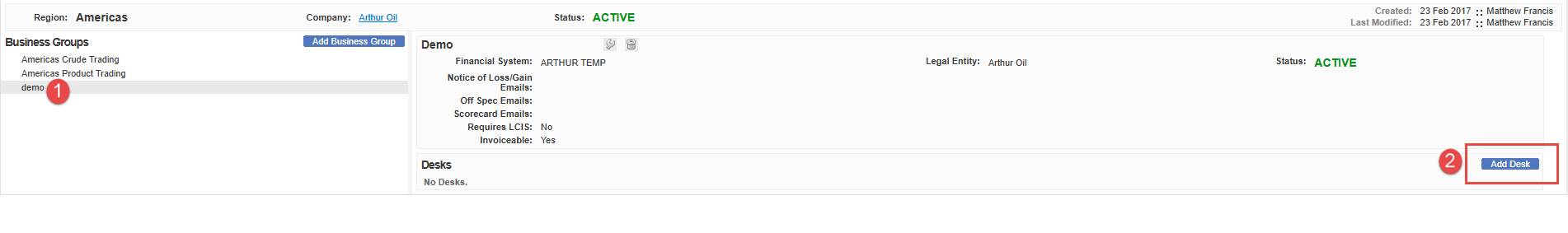•Desks: Finally, within each Business Group are the Desks. These are dedicated units responsible for specific tasks or functions. Desks can be used to distinguish operations within a business group. For example, one desk might oversee jet fuel and another might oversee Diesel Fuel.