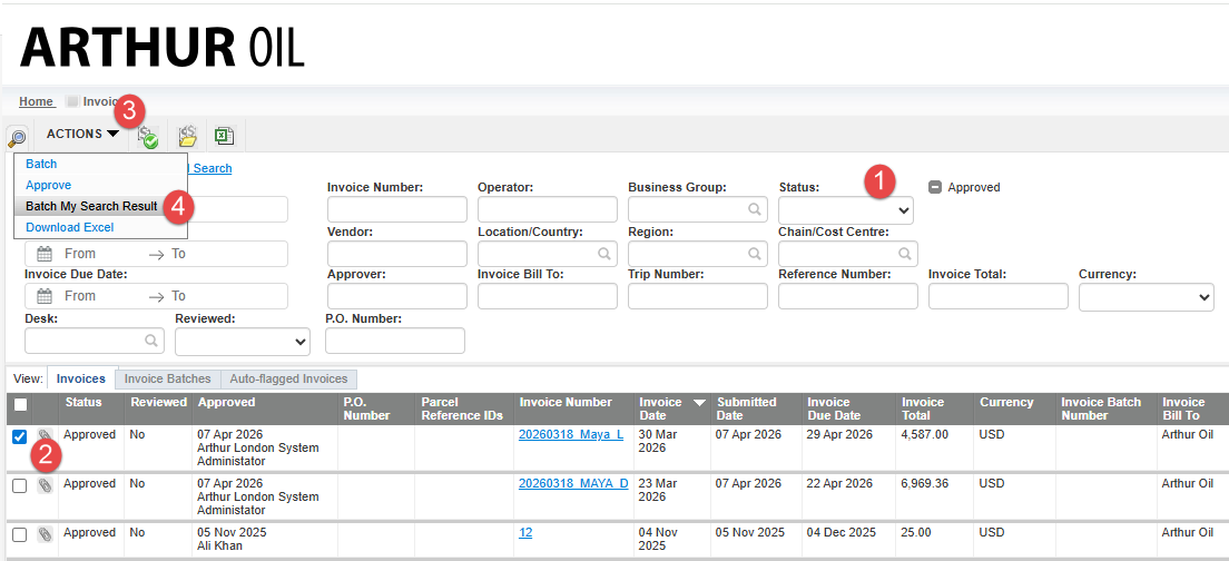 5. Search for the invoice directly by entering the invoice number or search for invoices in "Approved" status