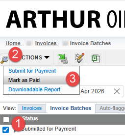 8. Select the batch (or batches) using the check box(s) on the Invoice Batches screen and clicking the “Mark as Paid” icon. NOTE: The status of the batch is "Submitted for Payment". The status of the individual invoice(s) are "Submitted for Payment"