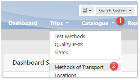 1. Select the Catalogue drop-down menu and click Methods of Transport