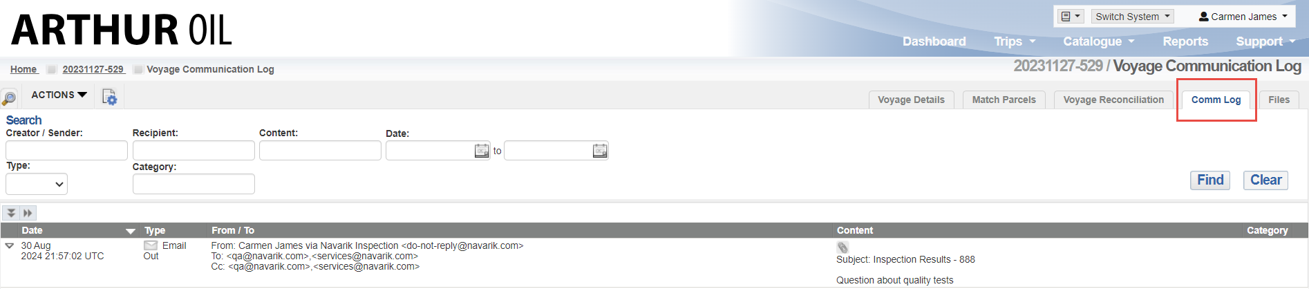Instead of opening your email and sending a new thread with questions, the emailing can take place directly on the voyage which will send the intended recipient an email notification and will be visible on the comm log.