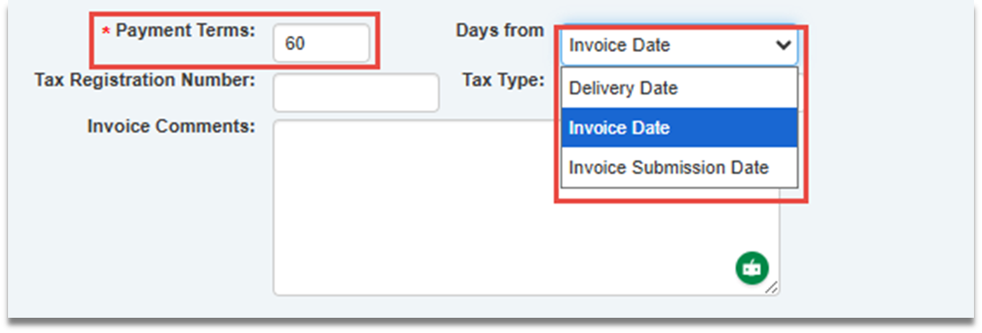 2. If an invoice is disputed by the cargo company, the inspection company can adjust the payment terms. Depending on the selection they make from the drop-down, the invoice due date (column found on the invoice viewall) could change, or it could stay the same.